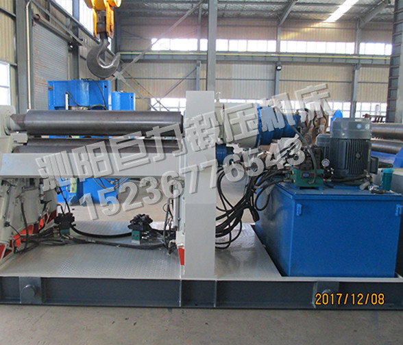 該四輥卷板機(jī)與對稱三輥卷板機(jī)比較,它可以不借助其它設(shè)備模具,直接予彎板材端部,而且剩余直邊較小;它可以不使板材調(diào)頭,而卷成工件。